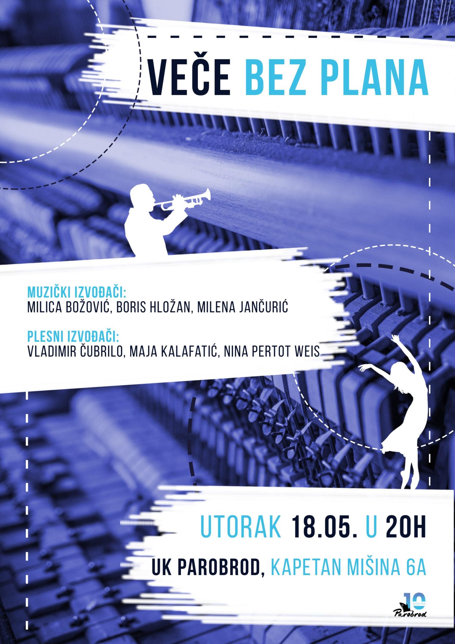 Maj je za jazz. U prvom izdanju ''Veče bez plana'' ujedinjuju se jazz muzičari i plesači. Slušaćemo Milicu Božović na kontrabasu, Milenu Jančurić na flauti i Borisa Hložana na gitari. Biće ovo jedna jazz mućkalica uz izvođače iz oblasti savremenog plesa. Vladimir Čubrilo i Maja Kalafatić uz gošću iz Slovenije Ninu Pertot Weis.