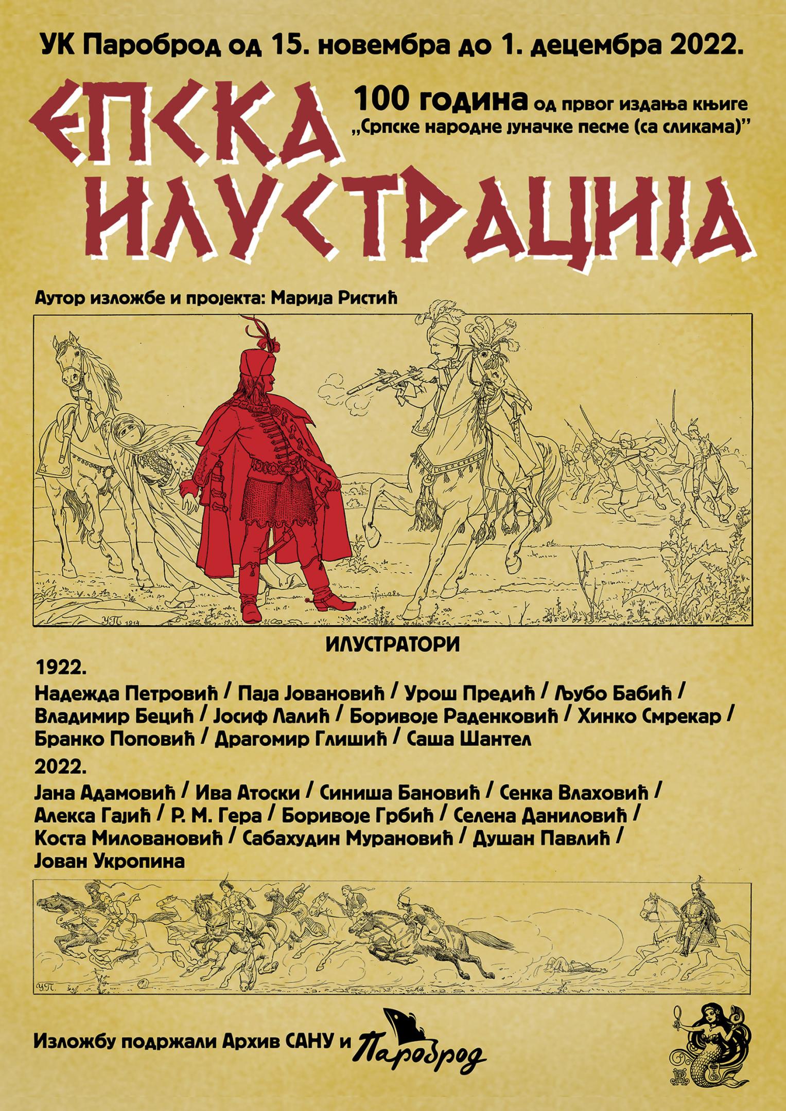 Изложба представља део пројекта „Теорија илустрације“, те се насловом изложбе установљава термин „епска илустрација“ и указује на значај „слика“ у књизи „Српске народне јуначке песме (са сликама)“ које су пре тачно сто година утрле пут формирању илустрације као засебне уметничке форме у оквиру наше уметности, а које су извели наши чувени уметници тог доба:. Паја Јовановић (1859 - 1957), Урош Предић (1858 - 1953), Љубо Бабић (1890 - 1974), Владимир Бецић (1886 - 1954), Јосиф Лалић (1867 - 1953), Надежда Петровић (1873 - 1915), Боривоје Раденковић (1871 - 1952), Хинко Смрекар (1863 - 1942), Бранко Поповић (1882 - 1944), Драгомир Глишић (1872 - 1957) и Саша Шантел (1886 - 1945).