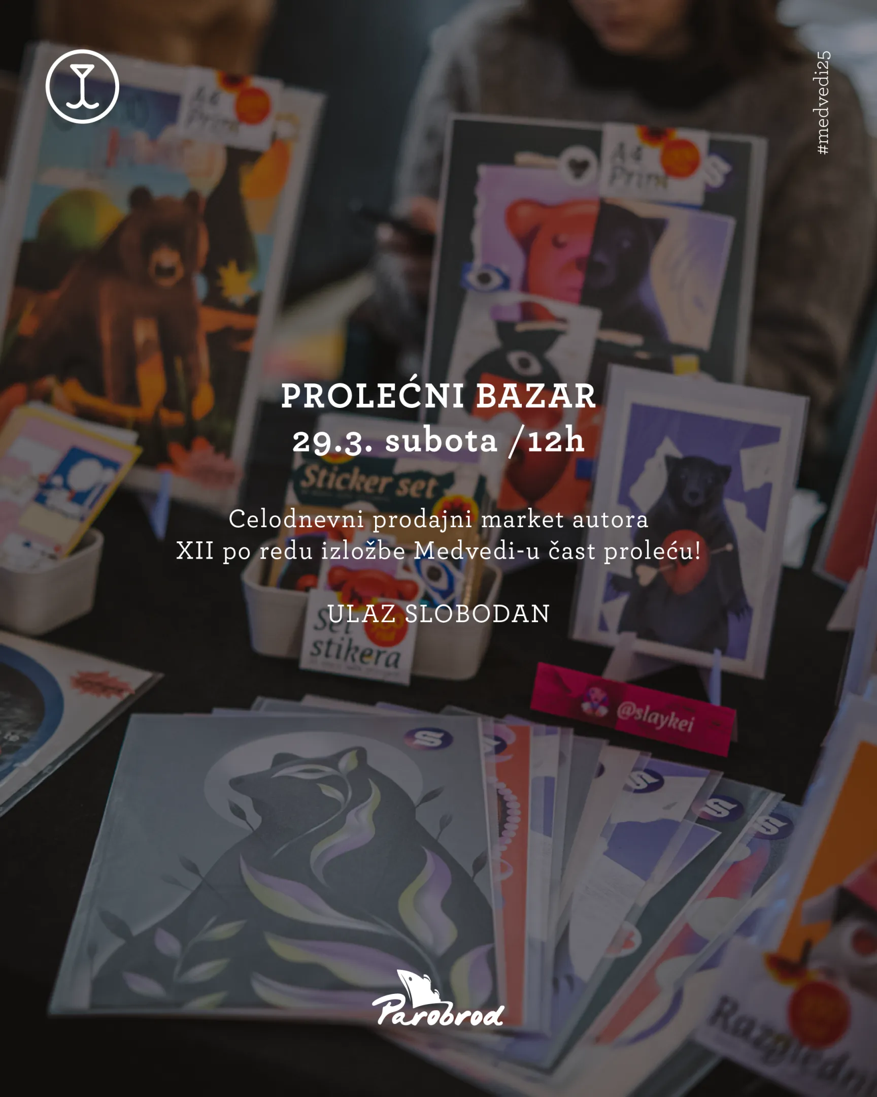 Подсећамо вас да је ПРОЛЕЋНИ БАЗАР у суботу 29. марта, као и да сте сви позвани да учествујете у целодневном маркету који ће се организовати у просторијама УК Пароброда. На располагању имамо 15 места, а можете изложити и радове који нису нужно везани за тему медведа. Као и увек, сав приход од могуће продаје иде вама. С обзиром да је број места ограничен, молимо вас да пријавите своје учешће најкасније до четвртка 27. марта како бисмо на време организовали све потребне ставке.