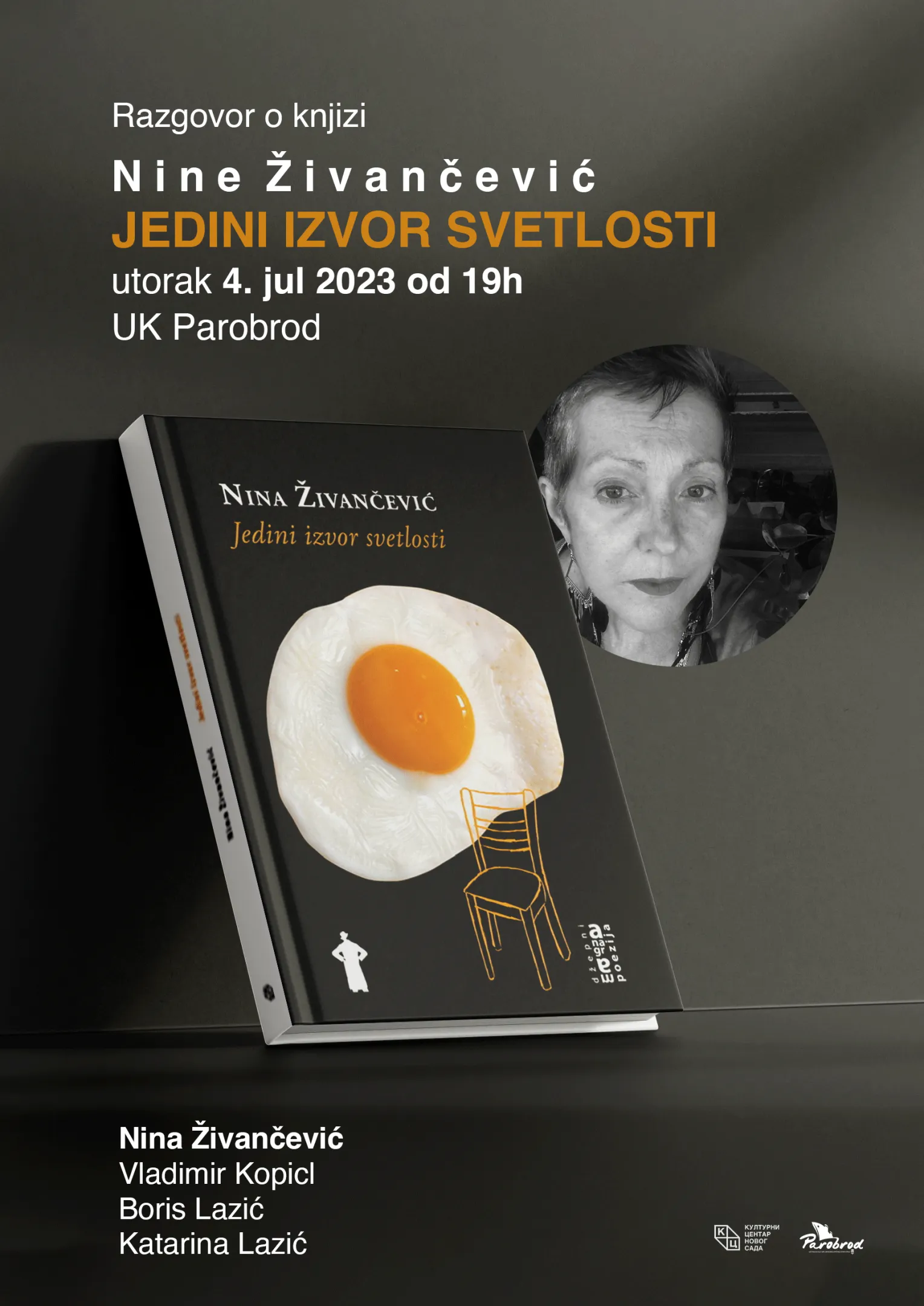 Разговор о новој књизи Нине ЖиванчевићЈедини извор светлости (Културни центар Нови Сад, 2023) награђеном рукопису за поетско стваралаштво 2021. државне институције Centre national du Livre (CNL) одржаће се у уторак04. јула од 19 часова у УК Пароброд