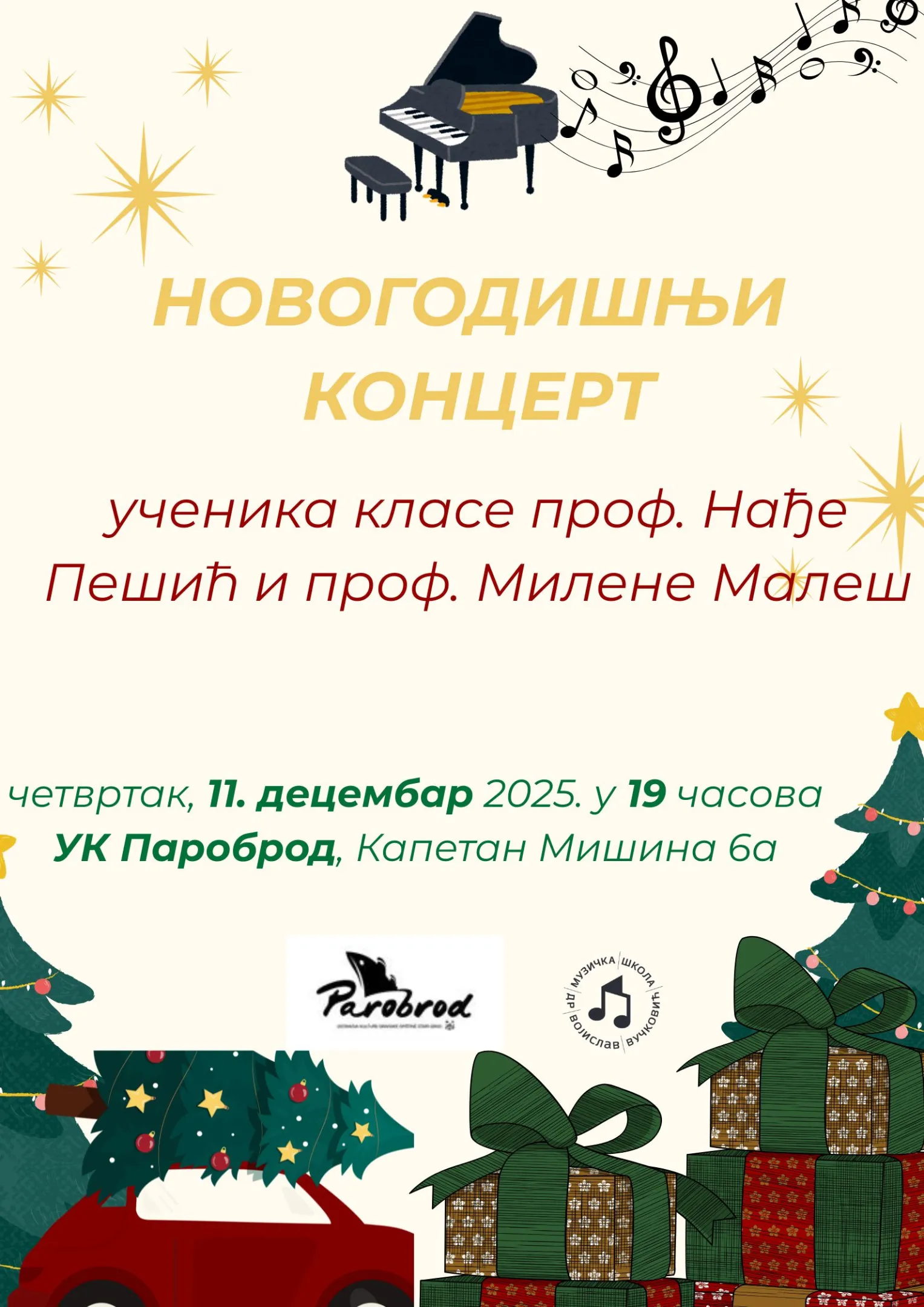 Новогодишњи концерт ученика клавира класе проф. Нађе Пешић (МШ "Др Војислав Вучковић) и проф. Милене Малеш одржаће се у четвртак, 11. децембра, у 19 часова и биће својеврстан угођај који ће нам приредити мали пијанисти узраста од 6 до 14 година.