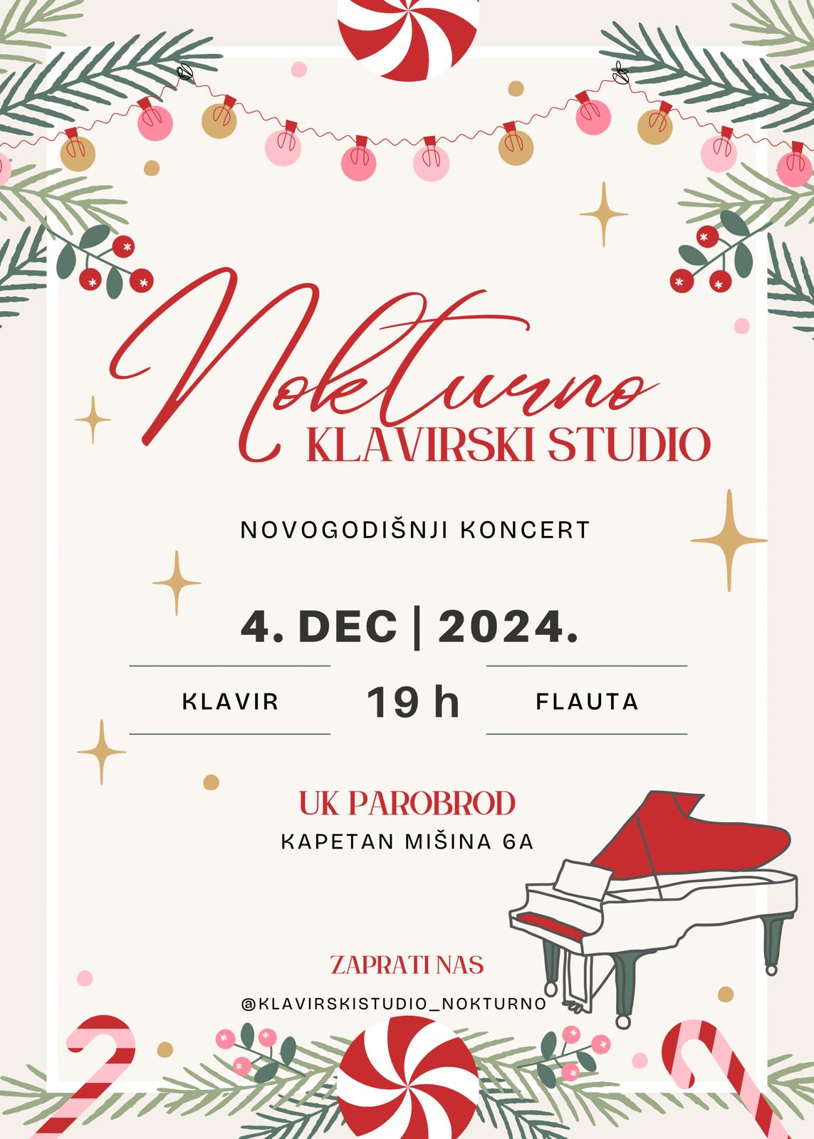 Са задовољством вас позивамо на Новогодишњи концерт Клавирског студија Ноктурно, који ће се одржати у среду 04. децембра, са почетком у 19 часова, у просторијама УК Пароброд.