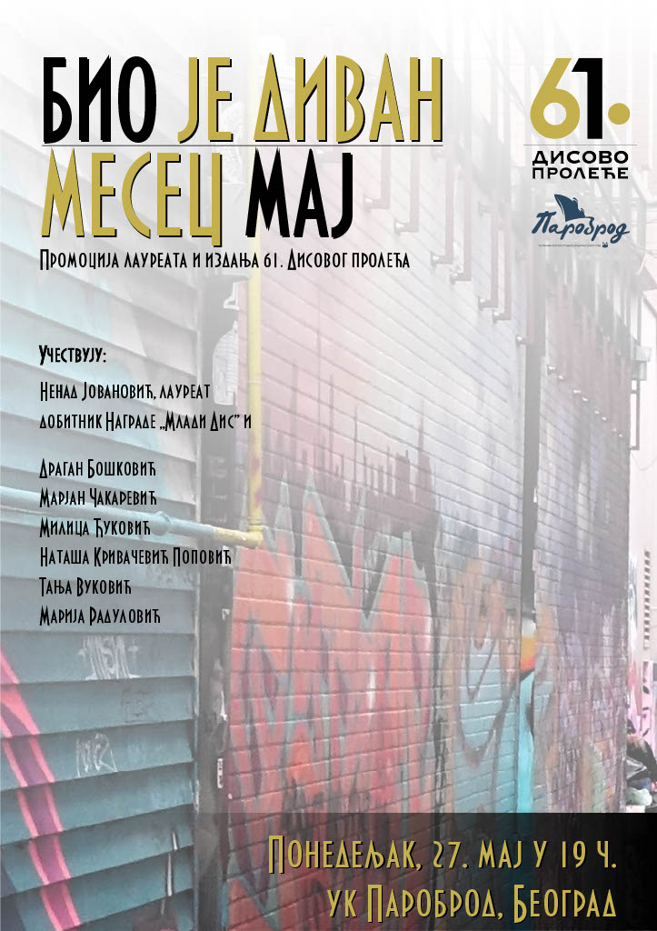 Такође, за све оне које желе да сазнају ко је овогодишњи добитник Награде „Млади Дис” и ко је аутор најбољег есејa o његовом песништву – ово је прилика за то. Милица Ћуковић и Марјан Чакаревић обратиће се у име жирија који су донели одлуку о носиоцима ових награда.