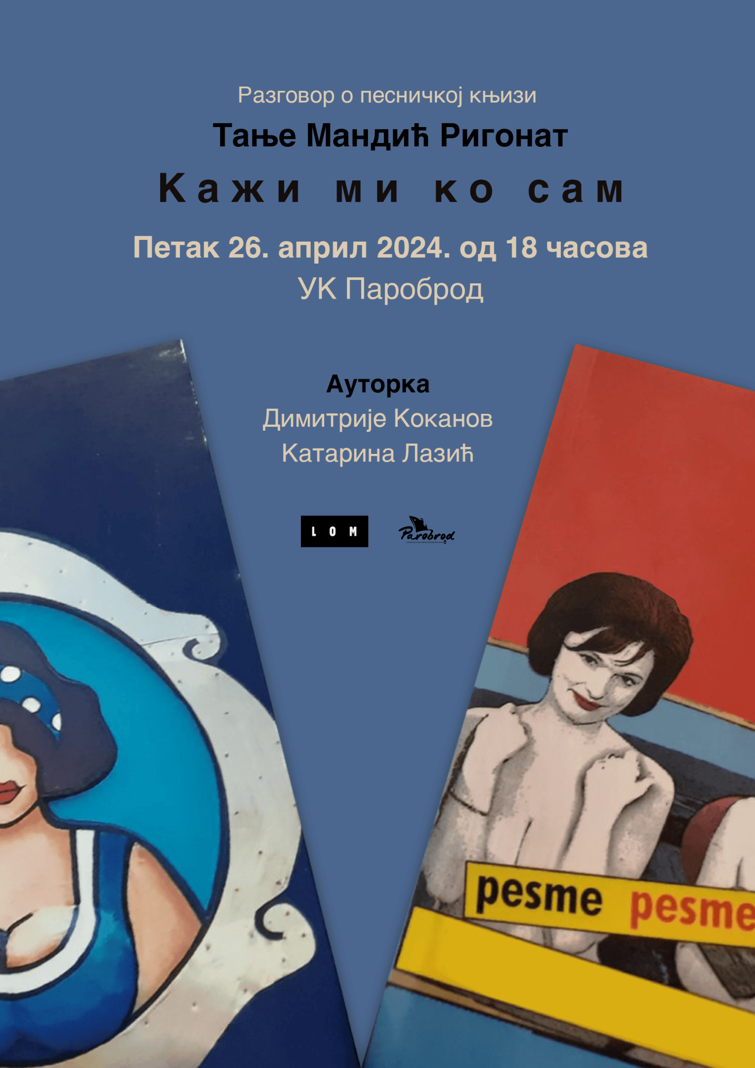 Промоција песничке књиге ''Кажи ми ко сам'' (Лом, 2022) београдске редитељке Тање Мандић Ригонат одржаће се у петак, 26.априла од 18 часова у УК Пароброд. Ово је интимистичка, исповедна поезији која демаскира жену редитељку у позоришту и износи начине личних освајања слободе. Осим ауторке, о ''Кажи ми ко сам'' говориће Димитрије Коканов, драматург и драмски писац из Београда, уз модерацију Катарине Лазић, уреднице књижевног програма у Пароброду.