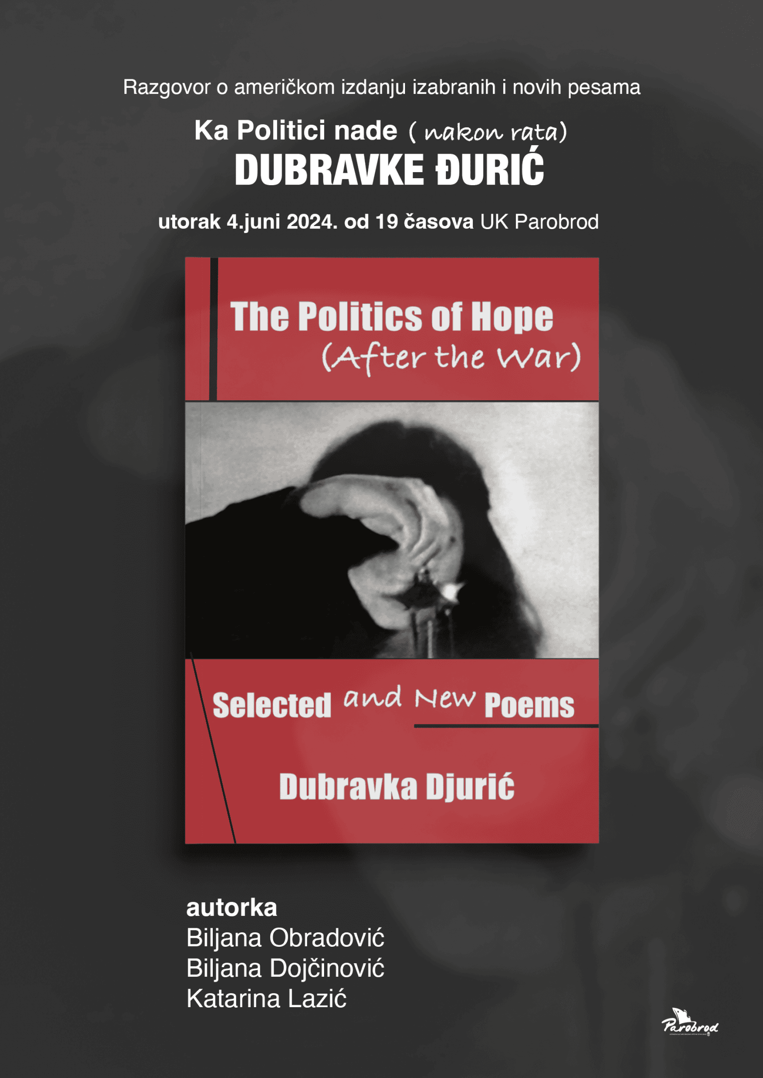 Разговор о изабраним и новим песмама др Дубравке Ђурић провокативног и актуелног назива ''Ка политици наде (након рата)  – The politics of Hope (After the War) : Selected and New Poems'', америчког издавача Roof Books, New York, 2023. са предговором  професора Чарлса Бернстина (Charles Bernstein) из САД, према избору и преводу др Биљане Д.Обрадовић, професорке енглеског језика и песникиње из Луизијане, САД одржаће се у уторак, 4. јуна од 19 часова у УК Пароброд.