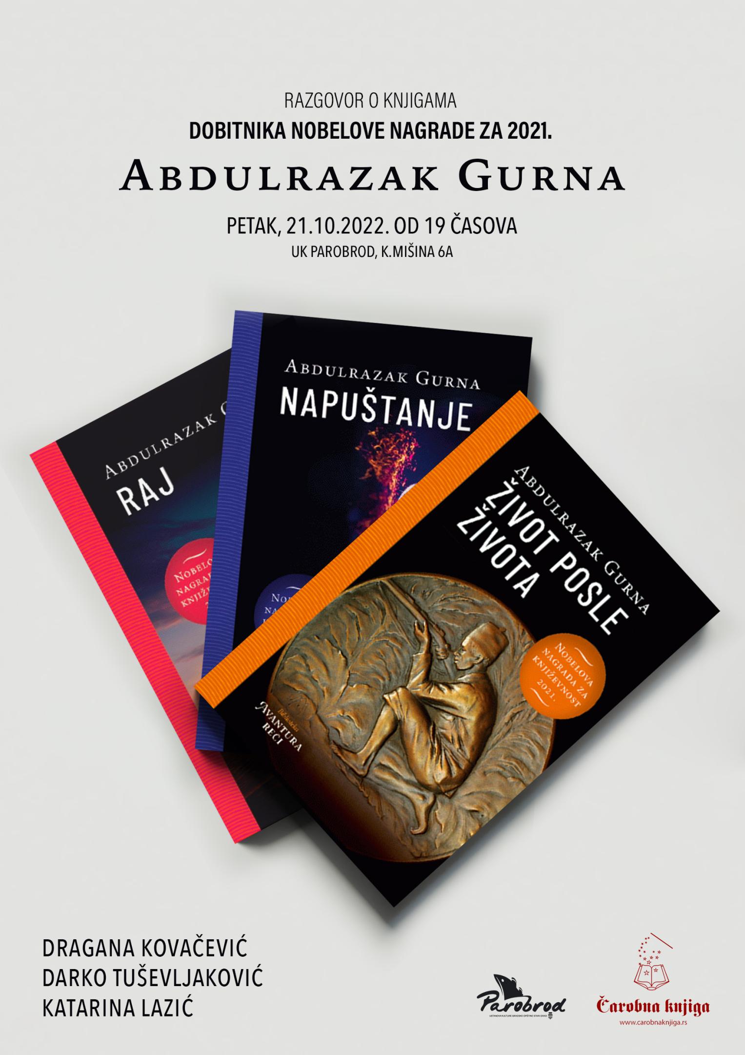 Разговор о књигама Абдулразака Гурне, прошлогодишњег добитника Нобелове  награде за књижевност, у издању новосадске Чаробне књиге, одржаће се у петак, 21. октобра 2022. од 19 часова у Пароброду.
