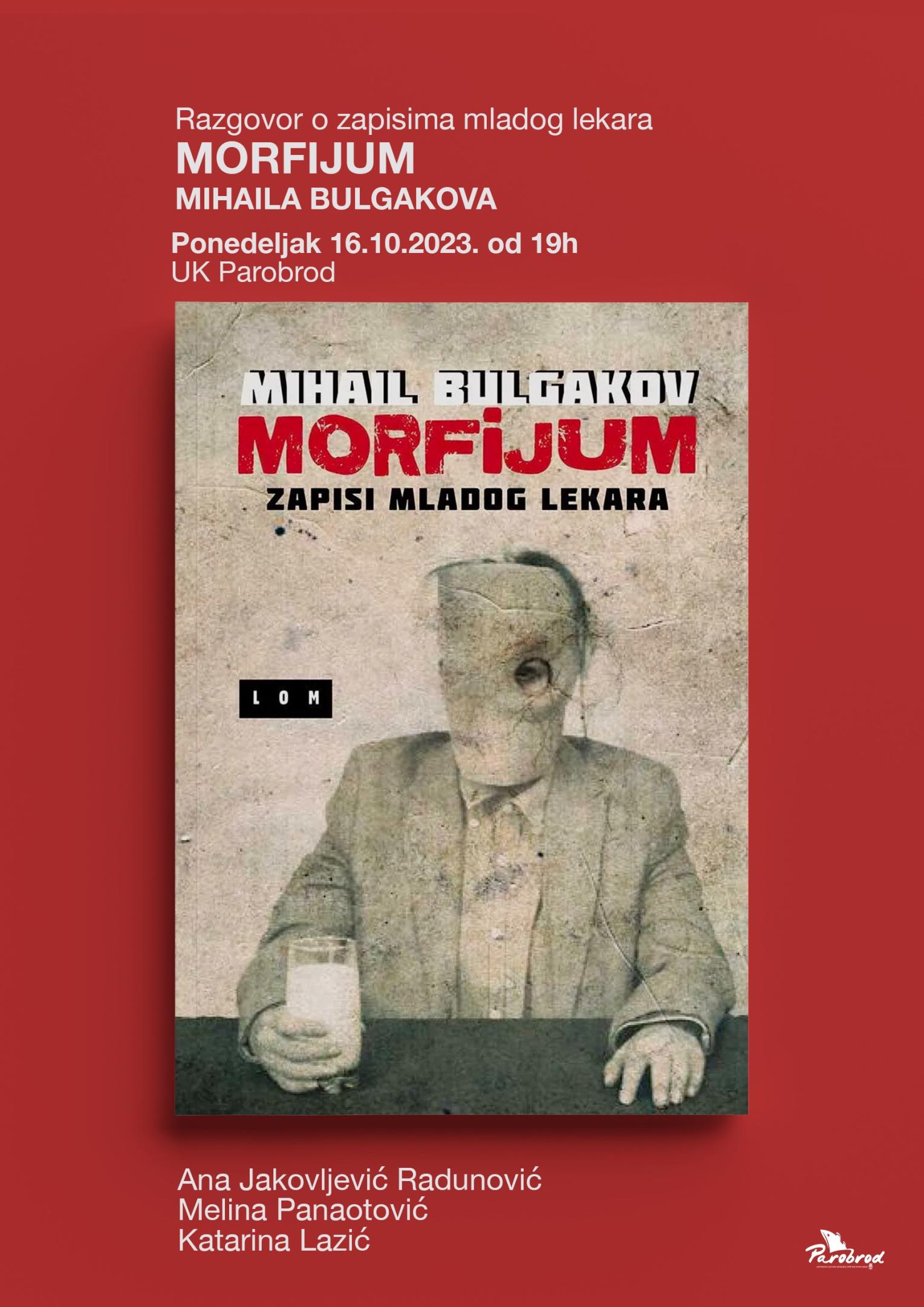 Разговор о књизи Морфијум- дневник младог лекара (превео с руског Милан Чолић, Лом - Београд, 2023) Михаила Булгакова одржаће се у понедељак, 16.10.2023 од 19 часова у УК Пароброд.