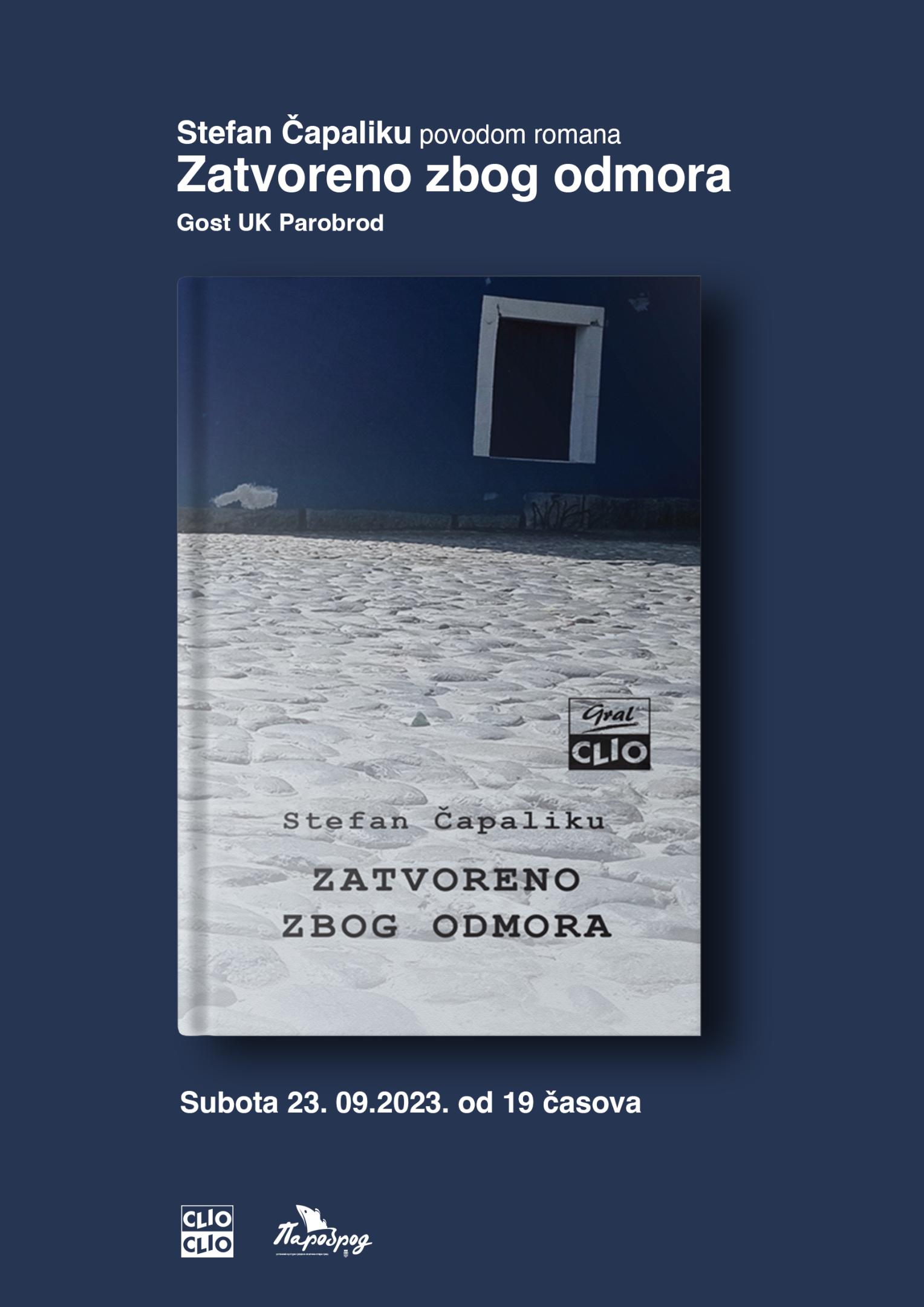 Разговор о роману Затворено због одмора (превео Данило Брајовић, издање, ИП Clio, едиција Gral, 2023) уз гостовање аутора Стефана Чапаликуа, одржаће се у суботу, 23.09.2023 од 19 часова у Пароброду. О роману чија се радња одвија између Београда, Тиране и Скадра, у јеку Другог светског рата, осим Чапаликуа говориће: Мирољуб Мики Стојановић, уредник ФЦС, Тамара Крстић, књижевна критичарка, Зоран Хамовић, главни уредник ИП Clio, уз превод Дамјана Филиповића и модерацију Тамаре Стојановић.