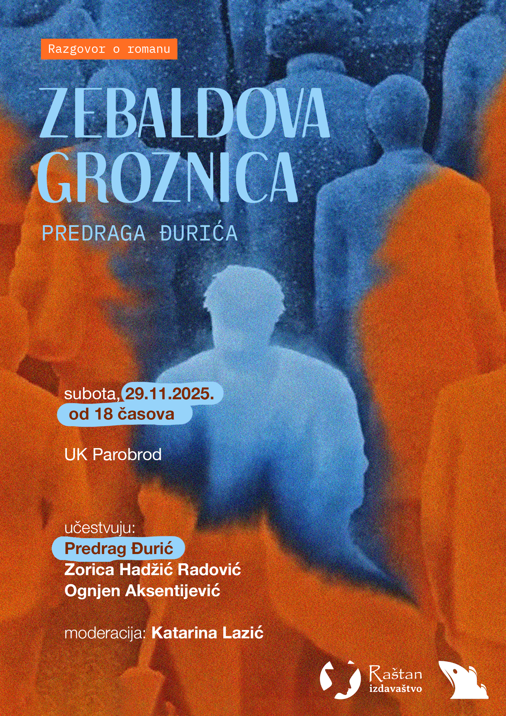 Разговор о Зебалдовој грозници (Раштан издаваштво,Београд, 2025) новом роману писца Предрага Ђурића одржаће се у суботу, 29. новембра од 18 часова у Пароброду. О овом омажу великом немачком уметнику Зебалду, у коме је приповедач вечити емигрант у односу на земљу у којој је рођен, осим аутора говориће Зорица Хаџић Радовић, књижевна критичарка и професорка Филозофског факултета Универзитета у Новом Саду, Огњен Аксентијевић, књижевник и уредник издања, уз модерирање Катарине Лазић, уреднице књижевних програма у Пароброду.