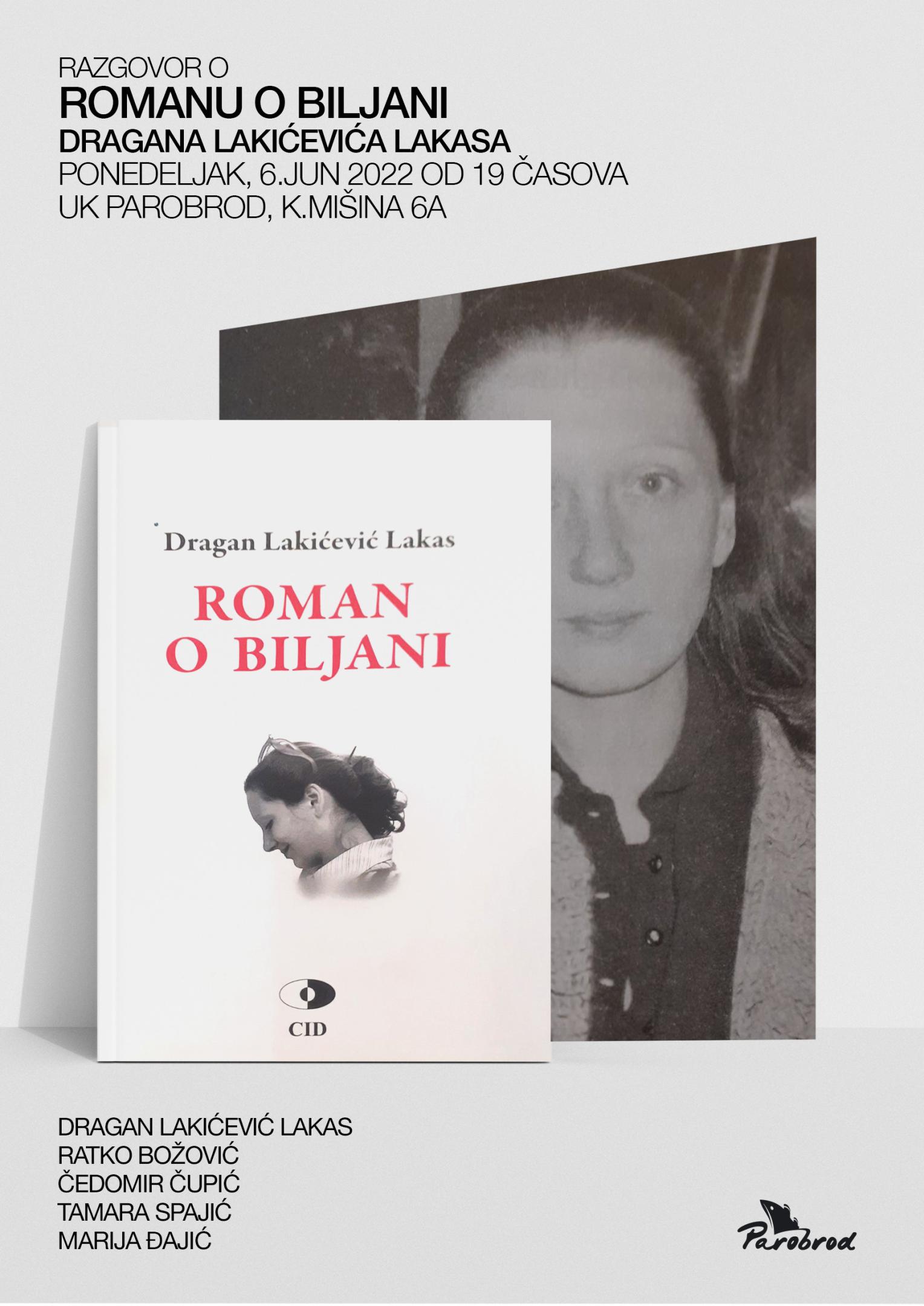 Разговор о романсираној биографији Биљане Јовановић - Роман о Биљани (ЦИД, Подгорица, 2021) др Драгана Лакићевића Лакаса одржаће се у понедељак, 6. јуна 2022 од 19 часова у УК Пароброд.