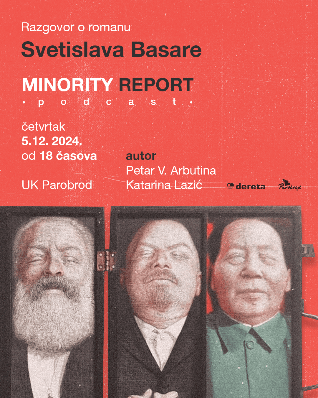 Нов роман Светислава Басаре Minority Report - podcast (Дерета, Београд 2024) биће представљен у четвртак, 5. децембра од 18 часова у УК Пароброд. Осим аутора, о овој пажљивој медитативној целини, од мношта питања и непријатних одговора, у којој је убиство Зорана Ђинђића чворишна тачка новије (и старије) историје Срба, говориће Петар В. Арбутина, књижевни критичар и уредник ове књиге, уз модерацију Катарине Лазић, уреднице књижевног програма у Пароброду.