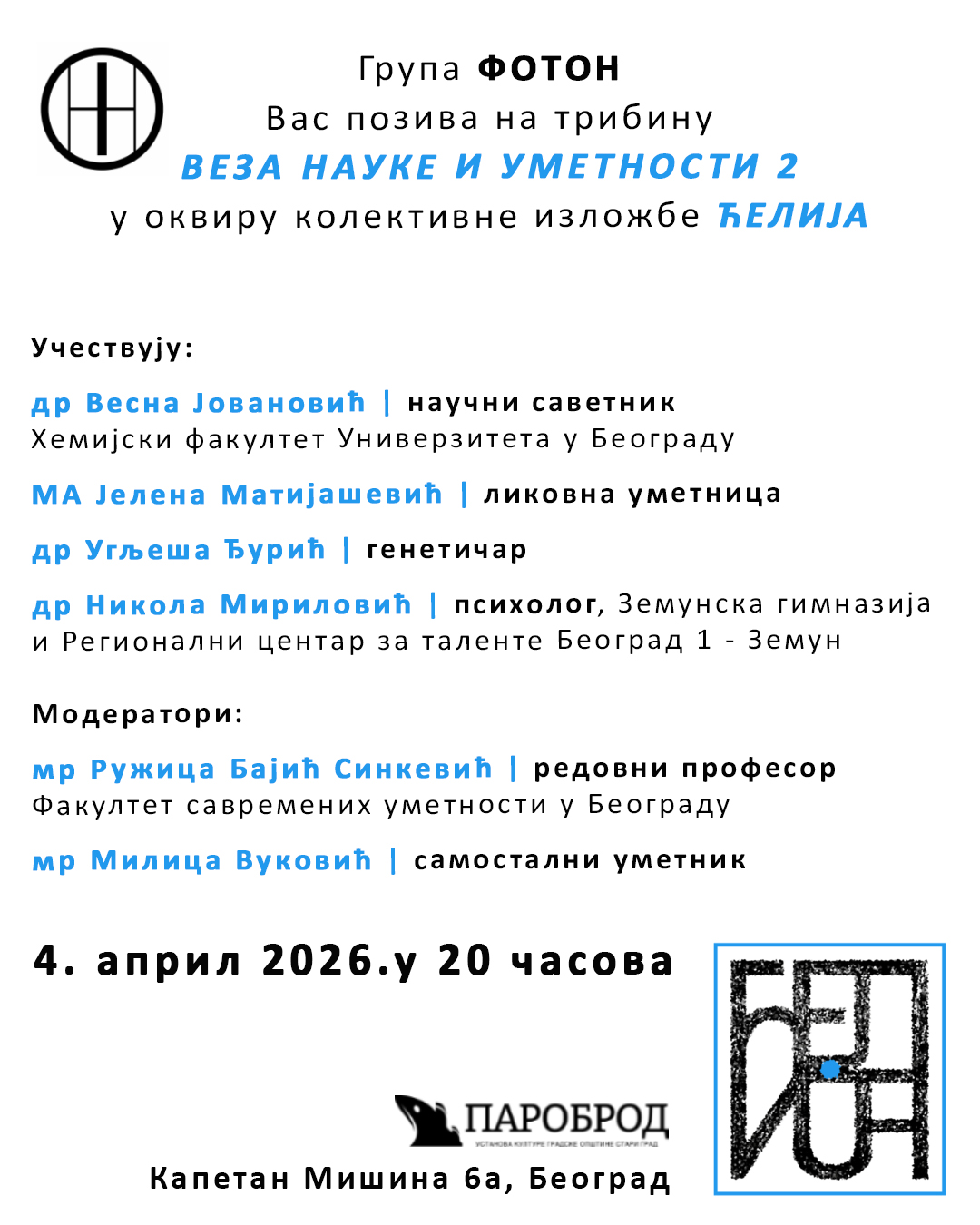 У оквиру колективне жириране изложбе „Ћелија“, уметничка група Фотон ће 4. априла 2026. године у 20 часова, организовати трибину „Веза науке и уметности 2“.