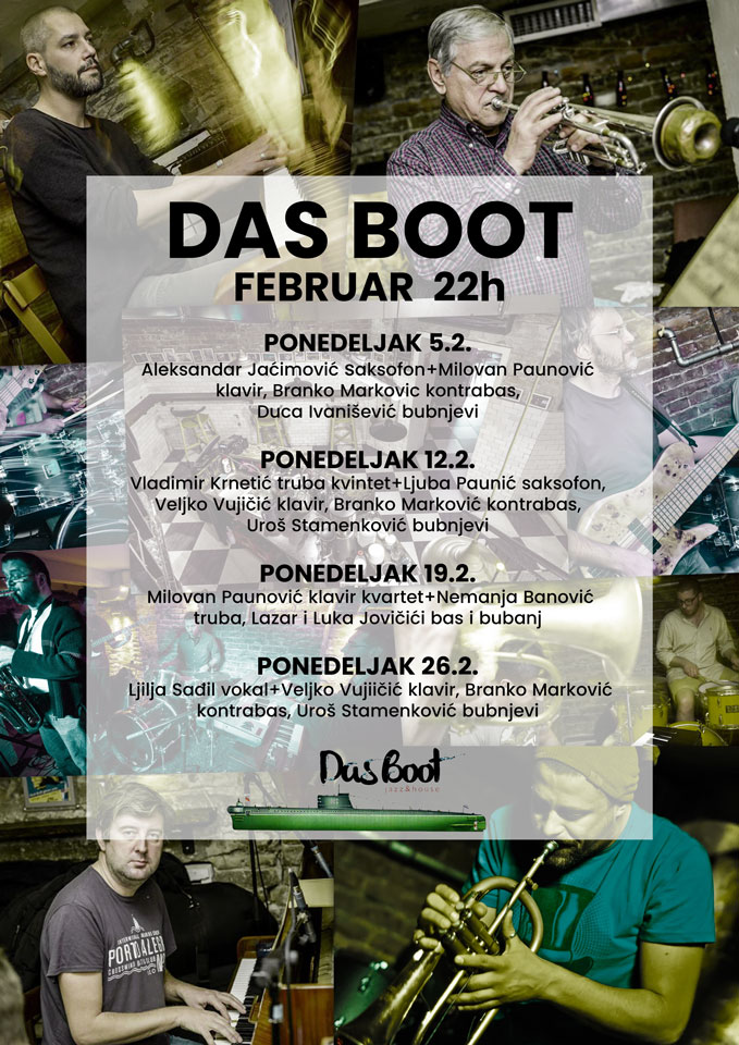 PON 12.02. Das Boot Vladimir Krnetić truba kvintet+Ljuba Paunić saksofon, Veljko Vujičić klavir,
