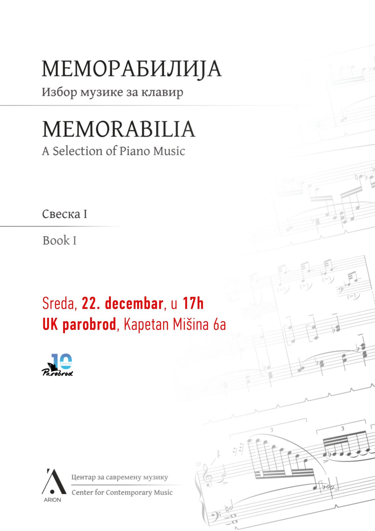 UK Parobrod i Arion – Centar za savremenu muziku predstavljaju koncertnu promociju prvog izdanja zbirke klavirske muzike u dve sveske pod nazivom Memorabilia I i II – Izbor muzike za klavir. U ovom izdanju nalaze se dela naših cenjenih kompozitora Vlastimira Trajkovića, Isidore Žebeljan, Ognjena Bogdanovića, Đura Živkovića, Stanka Simića, Marka Kovača, Dragana Latinčića i Milorada Marinkovića. Uz polučasovnu prezentaciju ovog izdanja posetioci će biti u mogućnosti da čuju i polučasovni koncert na kom će biti izvedena pojedina dela zastupljena u zbirci. Izvođači na klaviru su Stanko Simić, Marko Kovač i Vladimir Gligorić. U delu prezentacije izdanja u programu učestvuje i muzikolog Ivana Medić.