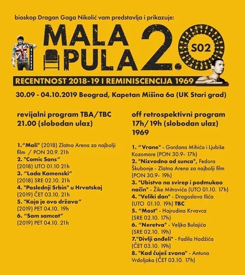 Mala Pula 2.0 kao revija - retrospektiva novog hrvatskog - regionalnog koprodukcijskog filma, pod podnaslovom recentnost i reminiscencija, biće prikazano 6 filmova iz dvogodišnje 2018-2019 novije produkcije, uključivši i prošlogodišnjeg pobednika film Antona Nuića “Mali” (ovogodišnjeg tamošnjeg kandidata za Oskara) koga baš kao i film Boba Jelčića “Sam samcat”, te Ladu Kamenski - Sare Hribar nismo imali prilike da gledamo u bioskopima u Srbiji.