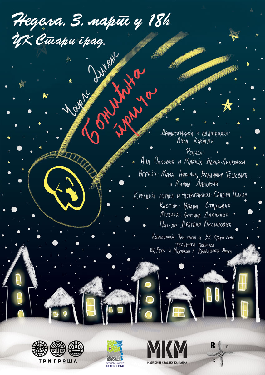 "Božićna priča“ u produkciji „Tri groša“ je lutkarsko-igrana predstava koja kombinuje različite tehnike. Tekstualni predložak je čuvena priča Čarlsa Dikensa u savremenoj dramatizacija Luke Kurjačkog. Tekst kombinuje naraciju kroz stih, dramski dijalog i neme scene, koje su postavka za tri različite tehnike, dominantne u izrazu predstave: živog glumca na sceni, lutke i grafoskop animaciju. Likovi na neobične načine vode publiku na put kroz svetove živih i mrtvih, i u prošlost, sadašnjost i budućnost. „Božićna priča“ Čarlsa Dikensa predstavlja možda i najveći među klasicima književnosti za decu. Dikens je napisao ovo delo posle posete jednom londonskom sirotištu, duboko potresen uslovima u kojima su tamošnja deca živela. Priča je pohvala velikodušnosti, oštra kritika ne samo škrtosti, već i izrabljivačkog odnosa prema zaposlenima i akumulacije novca na račun ovog izrabljivanja. Zastupanje stanovišta da bi i najtvrđi tvrdica mogao da se promeni kada bi na neposredan način spoznao strašne posledice svog delovanja – sve su ovo teme koje danas više nego ikad dobijaju na važnosti. Vrednosti koje klasici književnosti zastupaju predstavljaju temelje ljudskih vrednosti i savremenog društva koje se, nažalost, neretko podrazumevaju, a samim tim i preskaču u vaspitno-obrazovnom sistemu. Većina klasika književnosti pruža i mogućnosti za kreativni pristup scenskom izrazu, budući da su njihovi sižei poznati, a teme koje tretiraju sveprisutne su u odgoju čovečanstva.