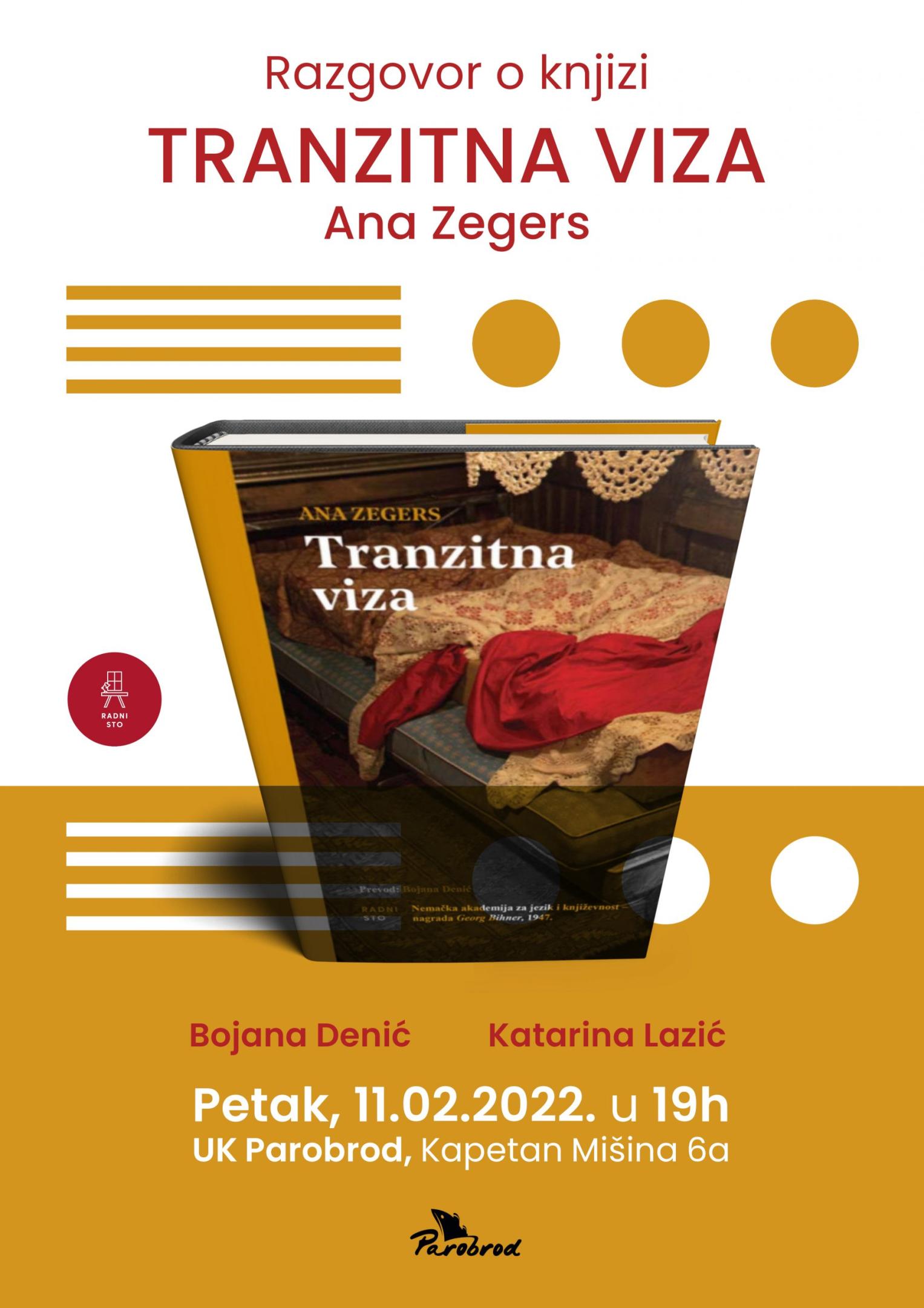 Razgovor o „Tranzitnoj vizi’’ Ane Zegers (Radni sto, Beograd, prevela Bojana Denić) održaće se u petak, 11. februara od 19 časova u Parobrod teatru, prvi sprat UK Parobrod. O ovom, prema mišljenju Hajnriha Bela, najboljem romanu Ane Zegers, razgovaraće Bojana Denić, urednica izdanja i prevoditeljka sa nemačkog jezika i Katarina Lazić, urednica književno-tribinskog programa UK Parobrod.