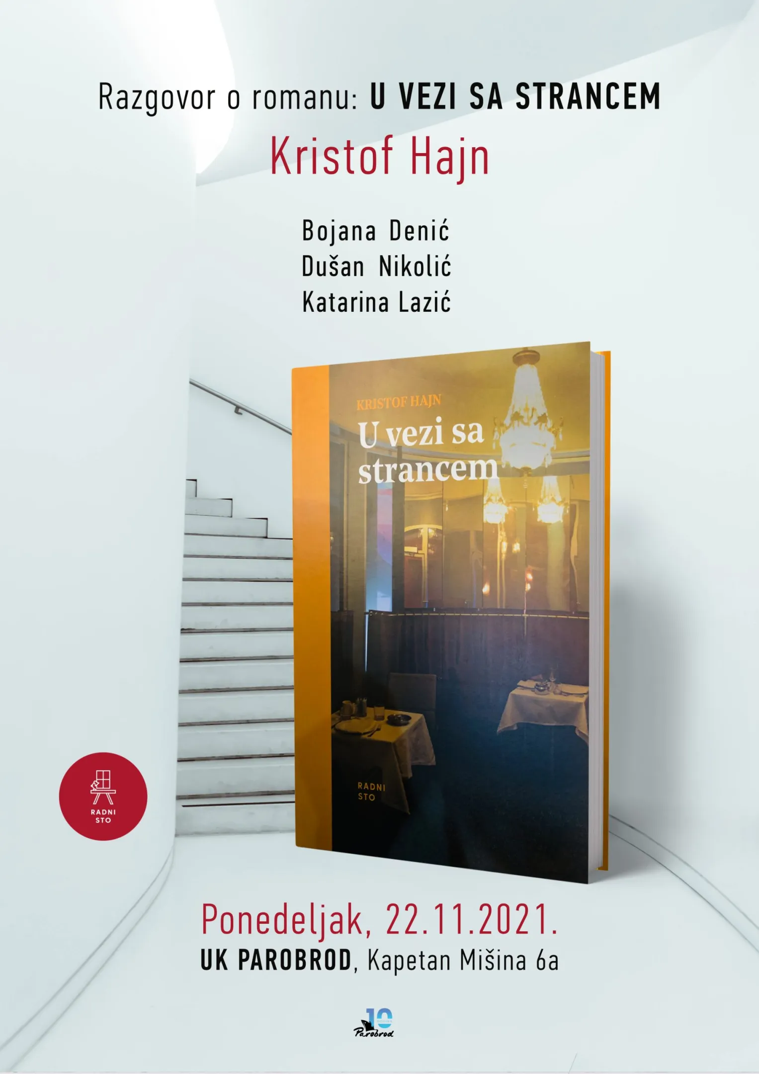 O romanu ’’U Vezi sa strancem’’ Kristofa Hajna (Radni sto, Beograd, 2019) istočnonemačkoj verziji ’’Stranca’’ Albera Kamija, u ponedeljak, 22.novembra od 19 časova u glavnom holu UK Parobrod, razgovaraće Bojana Denić, glavna urednica Radnog stola, Dušan Nikolić, germanista, koji je knjigu preveo i Katarina Lazić, urednica književng programa u Parobrodu.