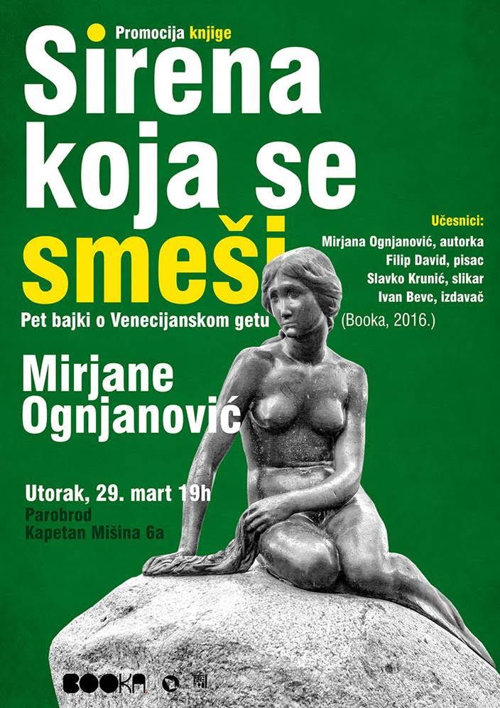 "Sirena koja se smeši" - pet bajki o venecijanskom getu Mirjane Ognjanović (Booka,2016) biće predstavljeno u Parobrodu, u utorak, 29.marta od 19 h u UK Parobrod, povodom obeležavanja pola milenijuma od osnivanja prvog geta nekadašnje Mletačke republike. Osim autorke, o ovim magičnim pričama, sa crtežima i akvarelima Aleksandra Palaveste, arheologa, govoriće Filip David, pisac, Slavko Krunić, slikar i Ivan Bevc, izdavač, uz moderiranje Katarine Lazić, urednice u Parobrodu.